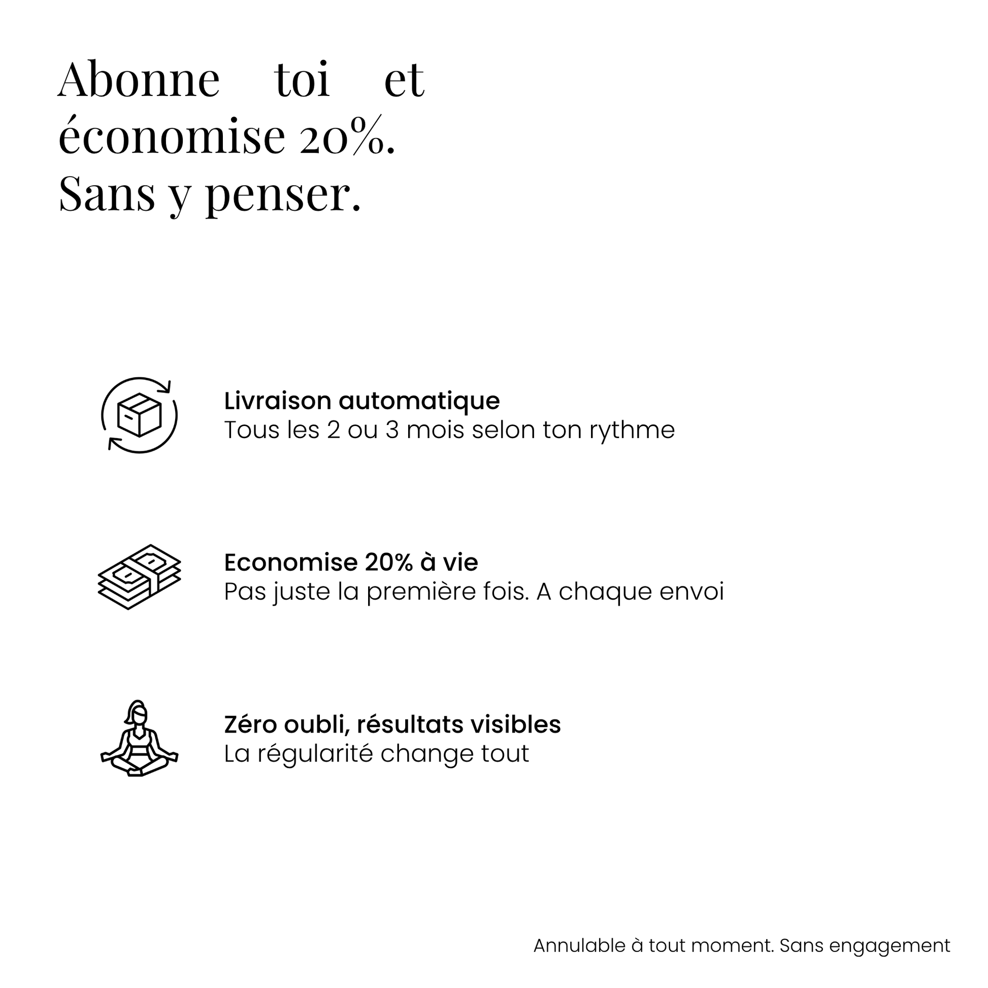 Avec nos options flexibles, tu peux recevoir 1 flacon tous les 2 mois ou 1 flacon tous les 3 mois. Tout est pensé pour s'adapter à tes besoins et ton rythme.